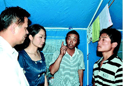 桑樂公司將滿滿的幾車救災(zāi)物資交到災(zāi)民安置點(diǎn)后,隨相關(guān)負(fù)責(zé)人一同進(jìn)入集中安置點(diǎn)進(jìn)行慰問。耿剛等人看到一座座藍(lán)色的災(zāi)民帳篷,災(zāi)民圍坐帳篷邊,心情十分沉重。當(dāng)他們走到