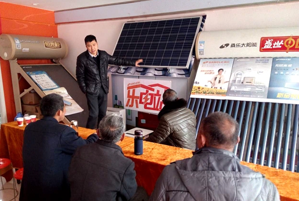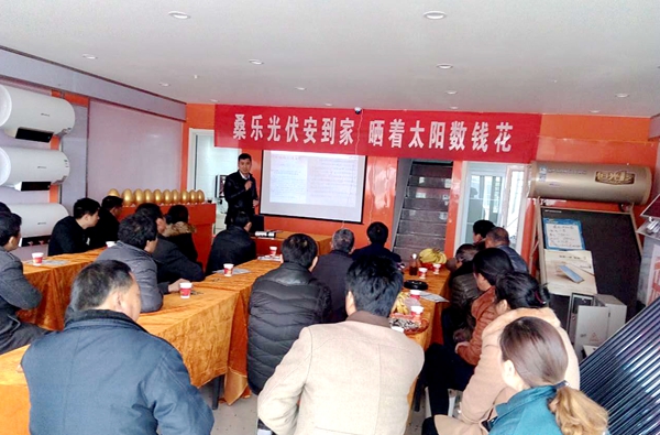 宿州光伏市場啟動較早,光伏鄉(xiāng)鎮(zhèn)樣板已經(jīng)基本建立完成,為了跟進市場發(fā)展節(jié)奏,桑樂宿州團隊積極安排布署光伏推介會。3月28日,光伏推介會如期在宿州義烏商貿(mào)城舉行,終端客戶和經(jīng)銷商共60多人參會,合肥分公司劉騰飛經(jīng)理主持會議。