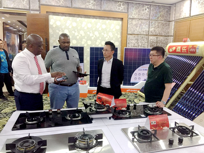 參觀完畢后,南非客戶又來到河北訂貨會(huì)現(xiàn)場,高朋滿座令南非客戶激動(dòng)不已。集團(tuán)副總馮磊向南非客戶介紹了公司近期的發(fā)展情況以及未來的戰(zhàn)略構(gòu)想,并帶領(lǐng)外商參觀了河北會(huì)議的桑樂展館,光熱、光伏、多元化廚電等產(chǎn)品琳瑯滿目,桑樂展品吸引了外商頻頻拍照,南非客戶表示將繼續(xù)加強(qiáng)與桑樂的合作。